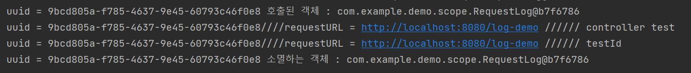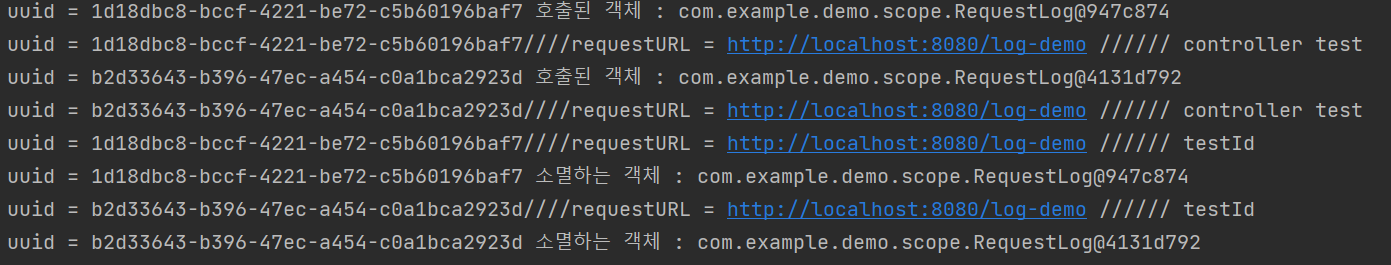 request 스코프는 HTTP요청 하나당 하나씩 생성되며, 해당 요청이 끝나는 순간 소멸된다. 이를 구분하기 위해 UUID를 통해 고유값을 부여했다.
