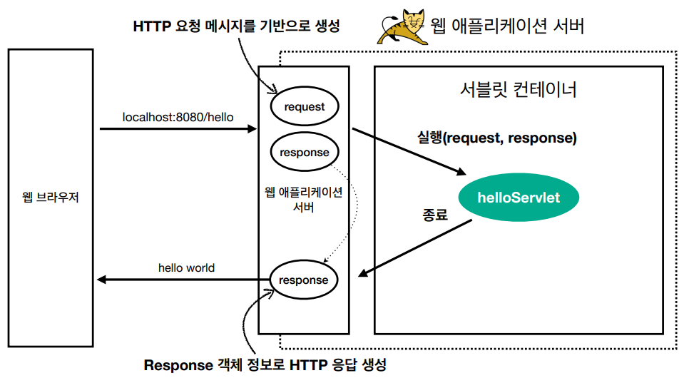 위와 같은 코드를 통해 "helloServlet" 라는 이름을 가진 서블릿은 서블릿 컨테이너에 저장된다. 이후 /hello url로 요청이 들어오면, HTTP요청 내용을 기반으로 만들어진 HttpServletRequest 객체(request)와, 아직 아무런 내용도 없는 HttpServletResponse 객체(response)가 미리 생성되어 서블릿 컨테이너에 보관되어있는 "helloServlet" 서블릿을 실행한다. 그리고 "helloServlet"가 종료될때 개발자가 작성한 내용을 기반으로 request 의 내용을 채워 클라이언트에게 전송한다.