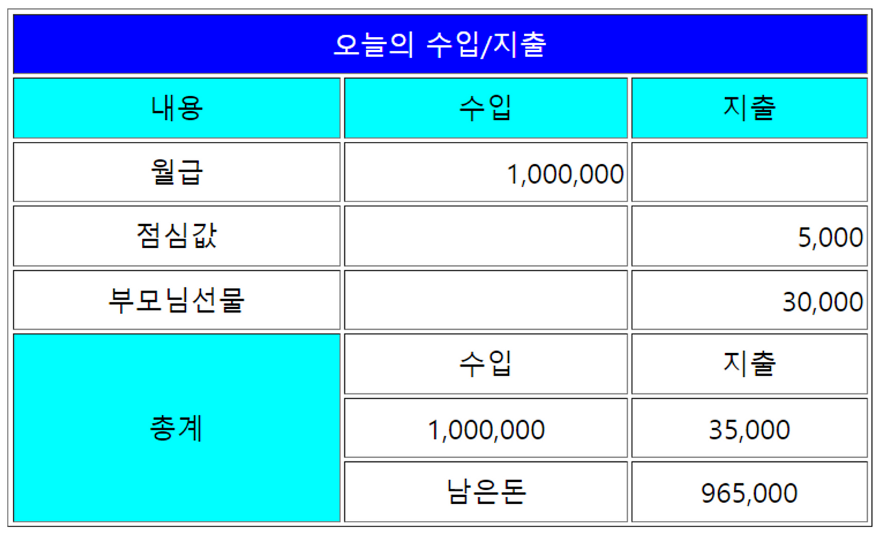 colspan: 속성값. 가로 칸수를 지정한다. 기본은 1칸이나, 1칸 이상을 차지하고 싶게 할때 사용한다.