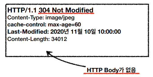 4. 그러면 서버에서 이를 검토하여 만약 서버가 가지고 있는 데이터가 수정된 버전(클라이언트가 보낸 날짜 이후에 수정됨) 이라면 새로운 데이터를 다시 보내주고, 만약 수정날짜가 동일하다면 HTTP바디가 없는 304 Not Modified 메시지를 보낸다.
