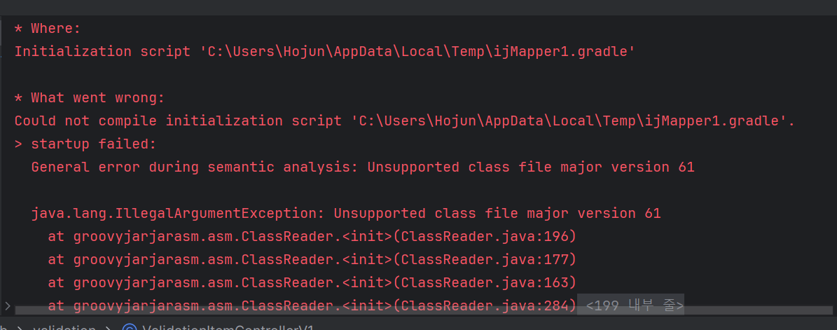 General error during semantic analysis: Unsupported class file major version 61 에러 외부에서는 잘 실행되던 스프링 프로젝트가 집에서 실행하니 이런 오류가 발생했다. 원인: 이 에러는 gradle과 jdk의 버전이 맞지 않아서 생기는 에러라고 한다. 자세한 사항은 공식 문서를 참조하자. 강의를 들으면서 제공한 프로젝트를 그대로 가져왔는데, 그로 인한 환경설정 차이가 일어난 것이다. 해결법: jdk 15 버전을 다운받아 적용시켜 해결했다. intellij 에서 자동으로 다운되는 azul - 15 버전을 이용했다. 에러 기록 2024.01.10