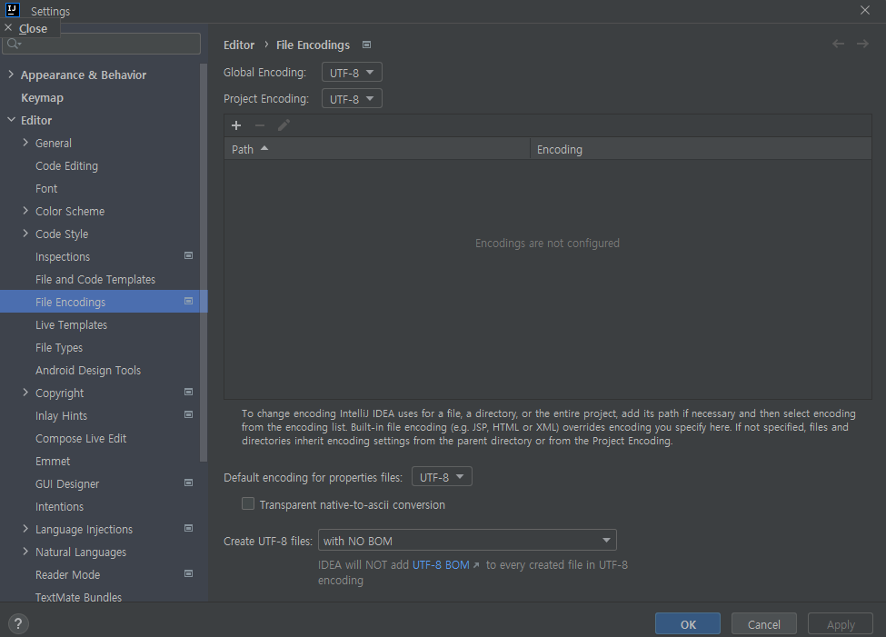 인텔리제이에서 properties 파일 한글 깨짐 properties 파일 인코딩이 안되는 문제다. 인텔리제이의 setting 에서 다시 설정해주면 된다. setting -> editor -> file encoding 에서 이처럼 변경해주자 에러 기록 2024.01.08